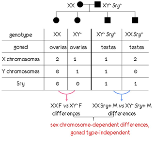 We study embryogenesis beginning at stages before the gonads are developed, in which all sex differences can only be attributed to the sex chromosomes, and during subsequent development, when both sex hormones and sex chromosomes contribute to sexual dimorphism.